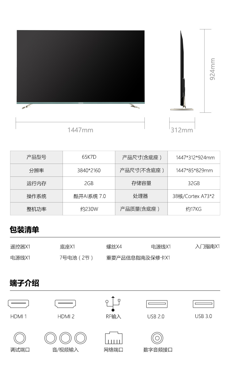 创维カム65 K 7 D 65インチー4 Kフルハウスリフレサールフレサーリフリング32 G记忆HDR人工知能液晶テレビ